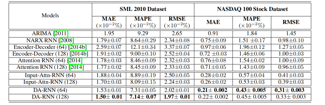 为展示 DA-RNN 模型的效果,作者将该模型和其他的模型在两个不同的数据集上的预测效果进行了对比,如表1所示。由表1可以看出,DA-RNN模型相对于其他模型,误差更小一些。DA-RNN模型在时间序列预测方面具有良好的表现。