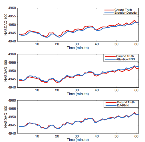表 1:SML 2010数据集和纳斯达克100股票数据集的时间序列预测结果 为了更好的视觉比较,我们将Encoder-Decoder 模型,Attention RNN 和 DA-RNN 模型的在纳斯达克100股票数据集上的预测结果在图2中展示出来。我们不难看出DA-RNN模型能更好地反映真实情况。