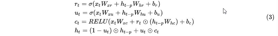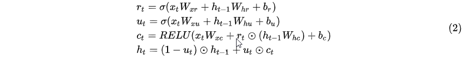 是元素的乘积,σ是sigmoid函数,x_t是该层在t时刻的输入,该层的输出是每个时刻的隐藏状态。根据经验,我们发现RELU作为激活函数可以提供更可靠的性能,从而使梯度更易于反向传播。