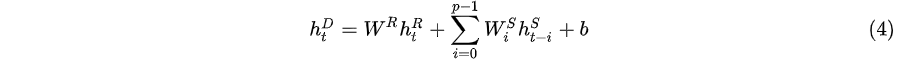 之后我们通过一个全连接层,间循环层和循环跳跃层的输出整合在一起。全连接层的输入包包循环单元在t时刻的的隐藏状态和 p 个(从 t-p+1 到 t )循环跳跃单元的隐藏状态。全连接层的输出计算过程为:
