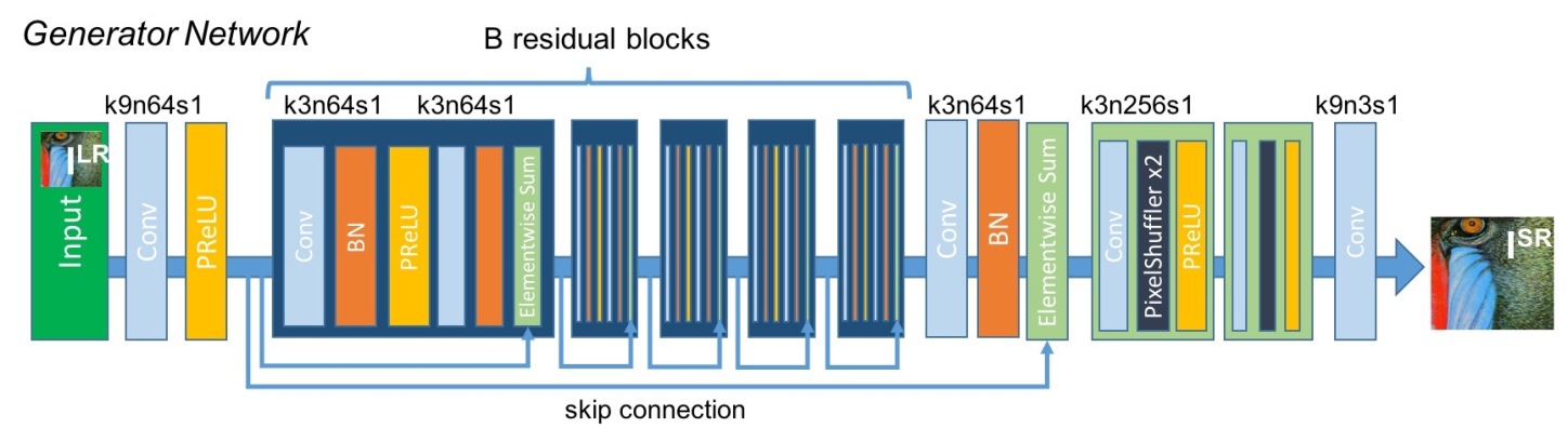 该模型的网络结构分为生成网络结构和辨别网络结构。生成网络结构基于Resnet网络结构,用于生成超分辨率的图像。辨别网络结构借鉴了VGG网络结构,用于辨别生成器生成的图片与原始图片的相似度。