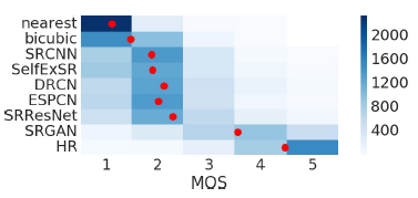 MOS是一种主观评价方式,文中作者让26个评价者对不同图像进行从1到5打分(原HR图为5分),取他们的均值作为该幅图像的MOS值。最终,各方法生成的SR图及原图的MOS评价结果如下: