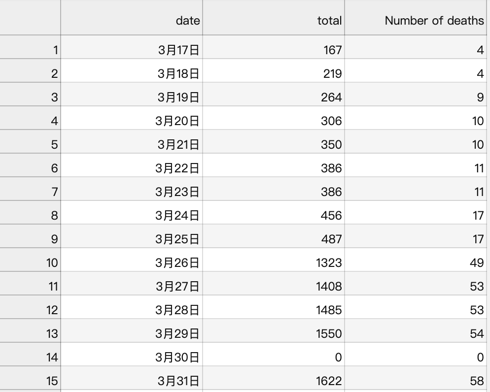 由于利用神经网络训练需要大量的数据,而新型冠状病毒的数据量目前较少,所以选择了数据稍微多些的2003年非典数据,数据是从2003年3月17日至2003年7月11日的感染人数和死亡人数的数据,数据格式如下。