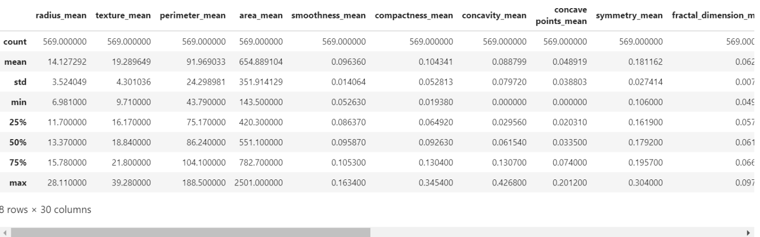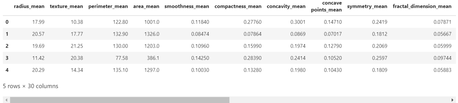 接下来我们来看特征,我们并不需要理解这些特征是什么意思,但是我们可以知道数据的方差(variance)和偏差(bias)以及数据中最大值和最小值是多少。这些类型的信息有助于了解数据的状态,好进行下一步的工作。 例如,area_mean特征的最大值为2500,smoothness_mean特征的最大值为0.16340。