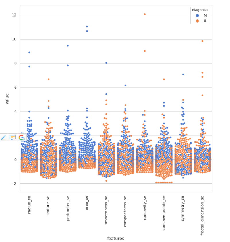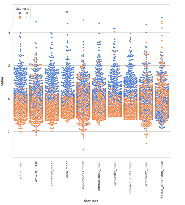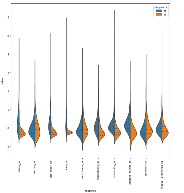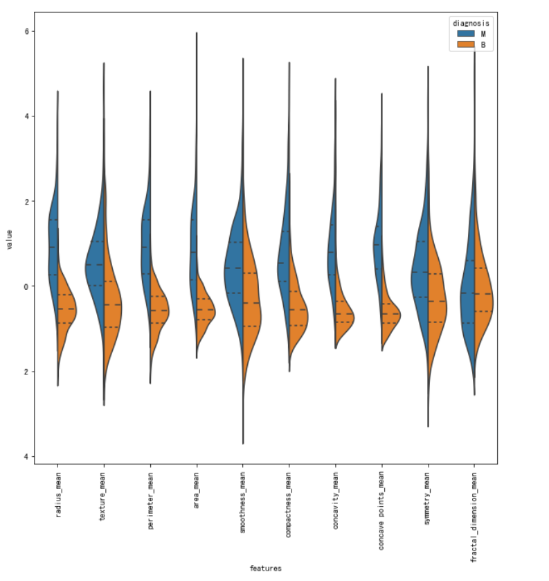 通过上面的小提琴图,我们可以看出texture_mean特征对应的标签分布良性和恶性分布的中心是区分开来的,而相比之下fractal_dimension_mean特征对应的分布则并不能很好的分开,所以texture_mean特征相对于fractal_dimension_mean更适合于用于标签的区分。