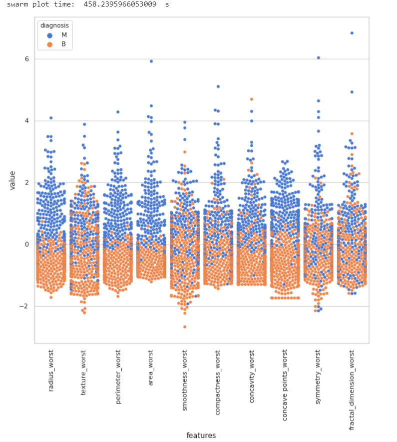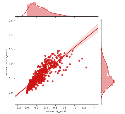 从上面的图可以得出一点,concavity_worst和 concave point_worst特征对应的标签分布看起来特别像,可以推断出他们很有可能是相关的,在大部分情况下,相关的特征可以舍弃掉其中一个。