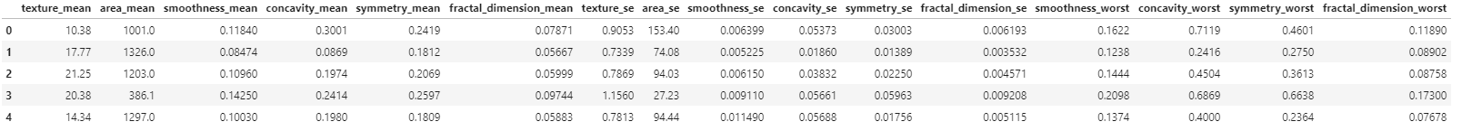通过上面的图表,我们可以通过相关性选择我们预测所使用的特征了。通过上面的热力图,我们可以看出 特征radius_mean,perimeter_mean 和 area_mean 是相关的(图中相关性为1.0的两个变量),所以我们可以只选择area_mean这个变量,之所以选择area_mean特征,是因为在swarm plot中area_mean的数据在良性和恶性分类上更加清晰可辨。同样的我们选择出其余的相关性不大的特征,得到如下我们可以丢弃的特征,并丢弃,得到剩余我们用于预测的特征
