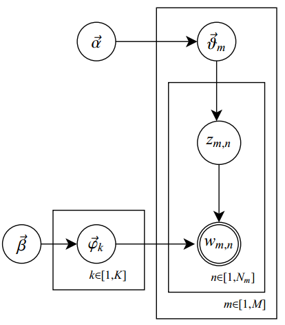 如图,其中结点表示变量,边表示可能的依赖关系。隐含结点为空心,观测结点为实心,盒子表示重复结构。则可以获得LDA模型的整体结构: