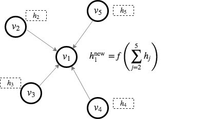 上面整个步骤可以看作一个message-passing的范式:每个节点会接受邻居节点的信息从而更新自身的节点表示。一个图形化的例子就是: