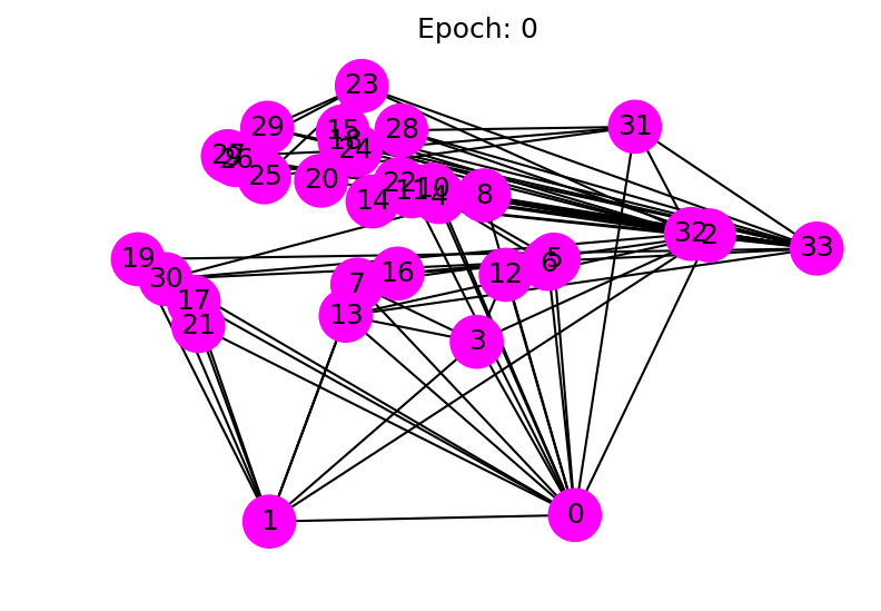 这是一个非常简单的小例子,甚至没有划分验证集和测试集。因此,因为模型最后输出了每个节点的二维向量,我们可以轻易的在2D的空间将这个过程可视化出来,下面的代码动态的展示了训练过程中从开始的状态到到最后所有节点都线性可分的过程。