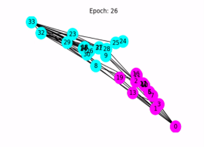 下面的动态过程展示了模型经过一段训练之后能够准确预测节点属于哪个群组。